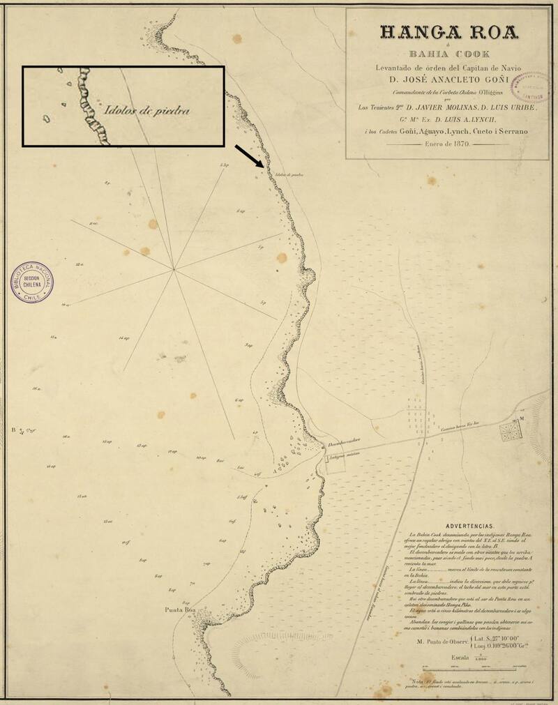 “El comandante, el capitán Lynch y el capitán Gana han visitado a los misioneros y enseguida, guiados por el capitán francés y actualmente de la isla Mr. Dutrou-Bornier han inspeccionado dos ídolos vecinos a la orilla. Se dice que uno es enorme y se renuncia a traerlo. El más pequeño, en perfecto estado, es obsequiado por el capitán Bornier”, escribiría Lynch en 1870.