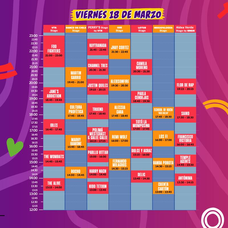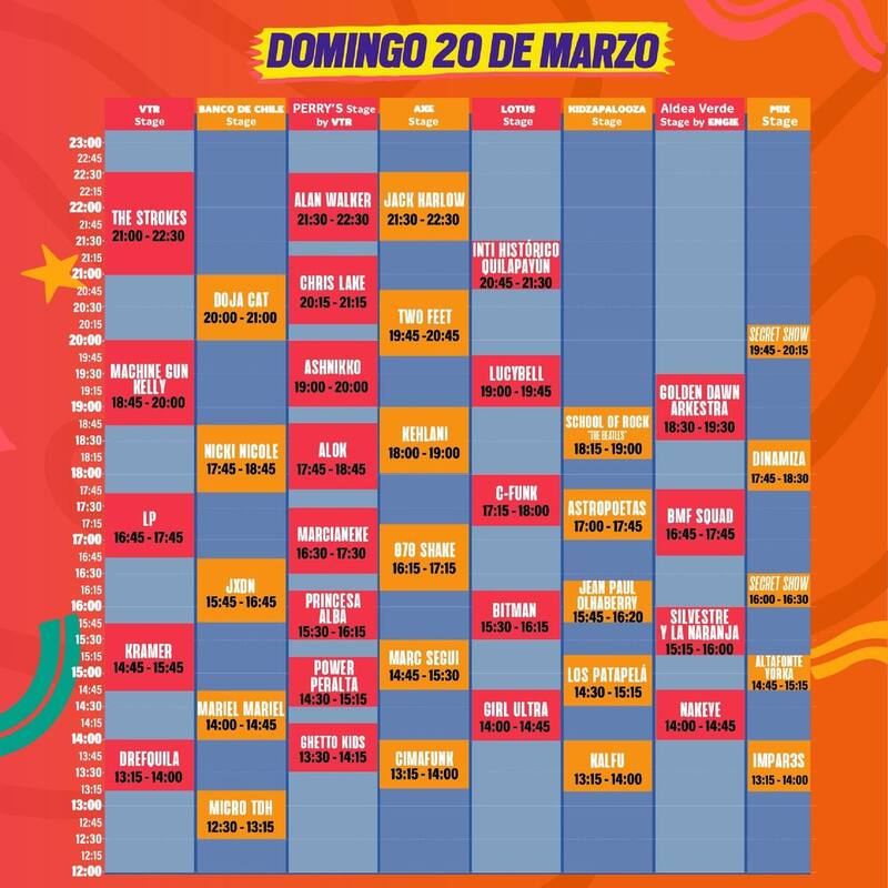 La postergada décima versión del festival arrancará al mediodía del viernes 18 de marzo con el chileno Kidd Tetoon y terminará el domingo 20 con The Strokes, Alan Walker y Jack Harlow. Foo Fighters y Miley Cyrus serán los encargados de cerrar las primeras dos jornadas, mientras que la estadounidense Phoebe Bridgers se baja de la cita. Revisa aquí los horarios y escenarios de los más de 100 nombres que estarán en el debut del evento en el Parque Bicentenario de Cerrillos.