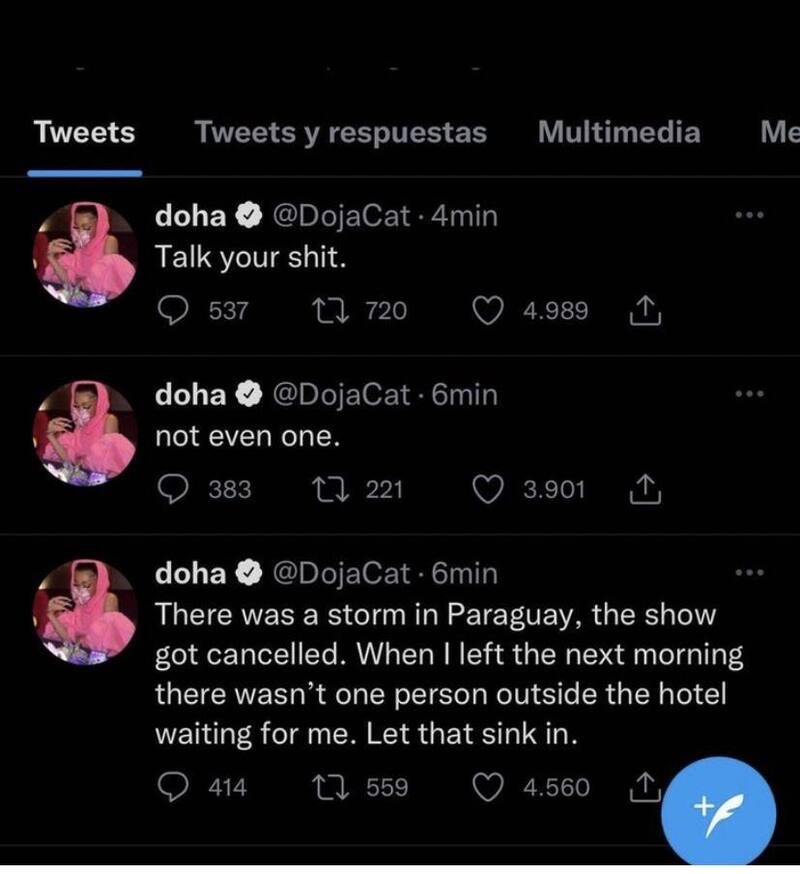 Tras esto, Doja Cat publicó un tuit que fue borrado posteriormente, en donde demostró su malestar debido a que, según ella, no hubo “ni una persona afuera del hotel” para despedirla tras su salida del país, “ni siquiera una”.