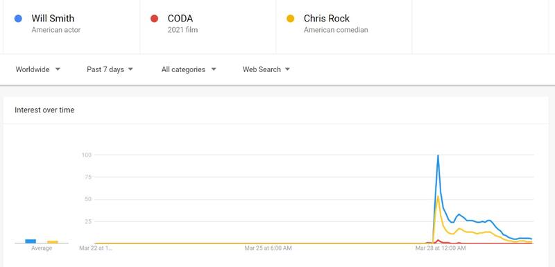 Las búsquedas alcanzaron su punto álgido precisamente después de que el actor golpeara al comediante Chris Rock, luego de que éste último realizara una broma dirigida a su esposa, la actriz Jada Pinkett Smith. Así, cerca de las 22:00 hora estadounidense, la búsqueda “Will Smith” alcanzó 54 puntos, “Chris Rock” 35 y “Coda” solo marcaba 1 punto.