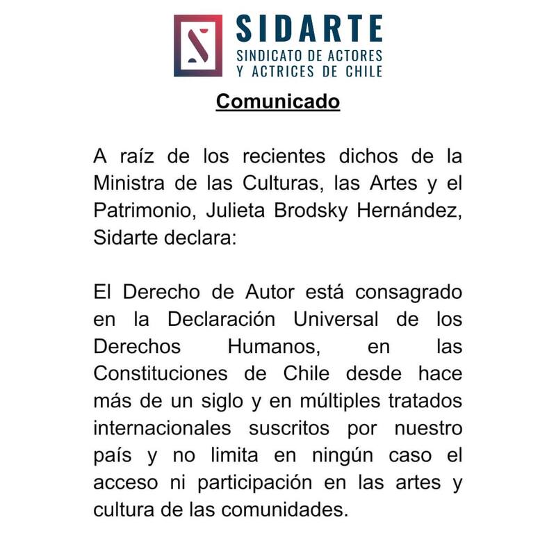Por otro lado, desde el Sindicato de Actores y Actrices de Chile, Sidarte, emitieron un comunicado donde señalaron: “El Derecho de Autor está consagrado en la Declaración Universal de los Derechos Humanos, en las Constituciones de Chile desde hace más de un siglo y en múltiples tratados internacionales suscritos por nuestro país y no limita en ningún caso el acceso ni participación en las artes y cultura en las comunidades”.