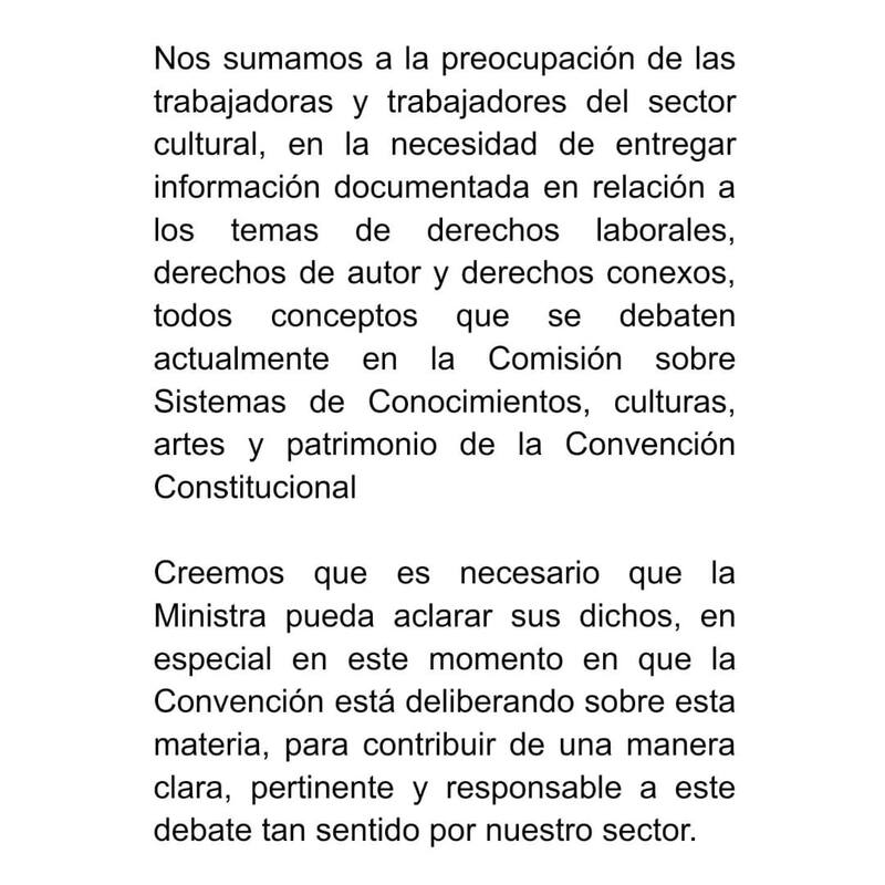 Y además, criticaron con dureza a Brodsky: “Nos parece inconcebible que la actual Ministra de Cultura desconozca la diferencia básica que existe entre el derecho laboral y el derecho de autor y es por esta razón, que le solicitamos que nos explique el origen y destino de sus dichos, ya que con ellos pareciera estar interviniendo en la actual discusión que ocurre en la Convención Constituyente sin tener claridad de la importancia y profundidad de lo que allí se debate”.
