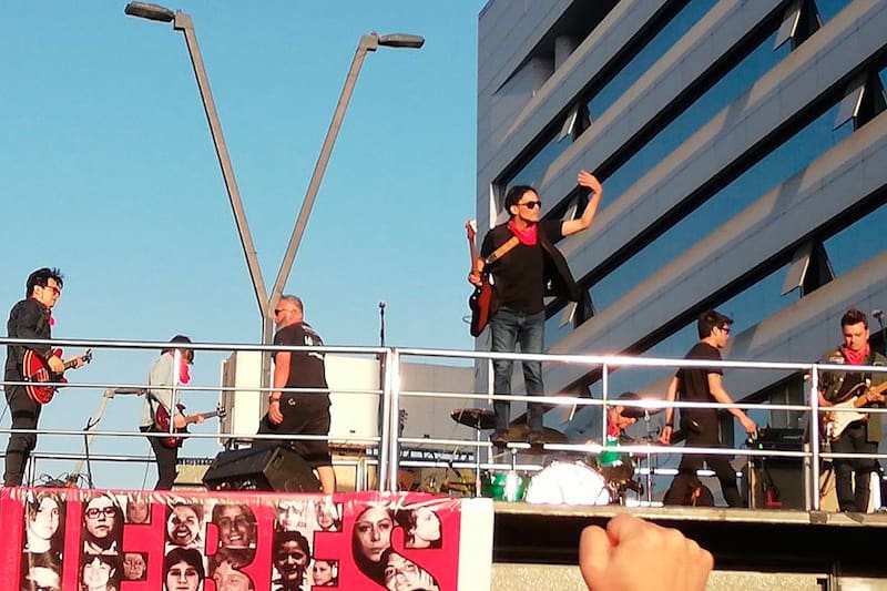 El camión fue ubicado al costado del edificio de Telefónica, ahí donde la Alameda se convierte en Providencia. Una multitud fervorosa llenó el lugar adelante y atrás del coloso mecanizado, y aplaudió a rabiar a las exactas 19.35 cuando el quinteto -todos con pañuelos rojos al cuello- se subió arriba del camión. Acto seguido, y como si fuese la primera tocata en un sucucho de Concepción, el vocalista Álvaro López señaló: