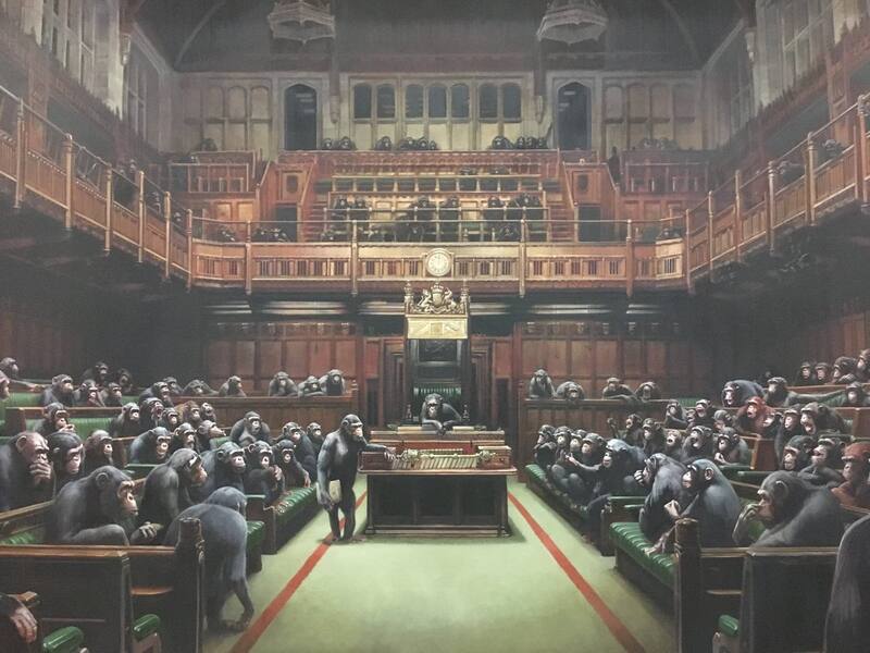 Otra de sus reconocidas obras es Devolved Parliament, donde reproduce al señero parlamento británico pero con monos en vez de parlamentarios. El cuadro fue otra de las obras millonarias del creador, ya que en 2019, y nuevamente en la casa de subastas Sotheby’s, el fresco se vendió por US$ 12 millones (unos 10 mil millones de pesos chilenos).