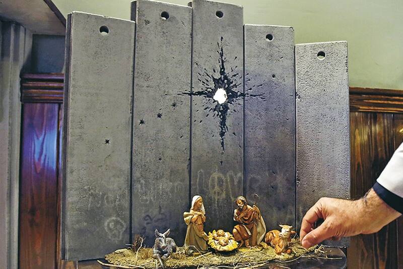 Pero así como usa la ironía para reírse de la industria del arte, Banky también ha desplegado una actividad más crítica en su trabajo. Por ejemplo, en 2019 presentó Pesebre amurallado en Cisjordania. Las figuras de María, Jesús y José estaban instaladas delante de unas piezas de hormigón que simulaban el muro de Israel con un impacto de bala que reemplazaba la estrella del nacimiento.