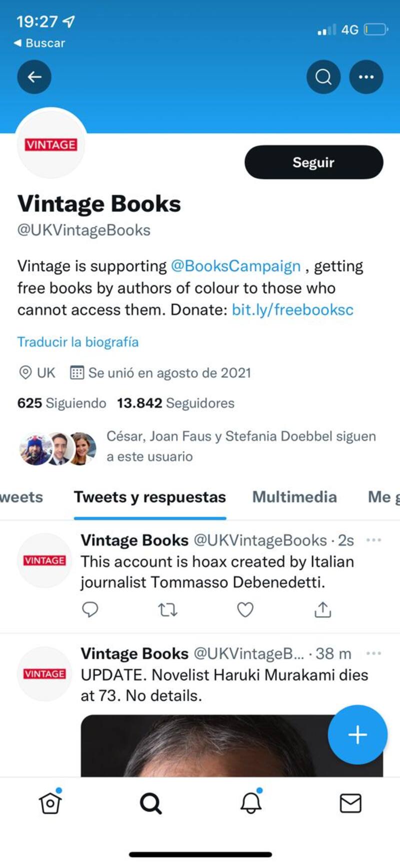 Sin embargo, con el correr de los minutos no se conocían mayores detalles. Desde el grupo Planeta, que publica a Murakami en castellano a través del sello Tusquets, no se confirmaba la información. Tampoco las principales agencias noticiosas internacionales del orbe, como AP, AFP, EFE o Reuters, daban cuenta de la noticia, y faltaba alguna versión de su familia. Aunque el hecho de que la cuenta solo tuviera 4 tweets publicados daba algo de margen para sospecha.