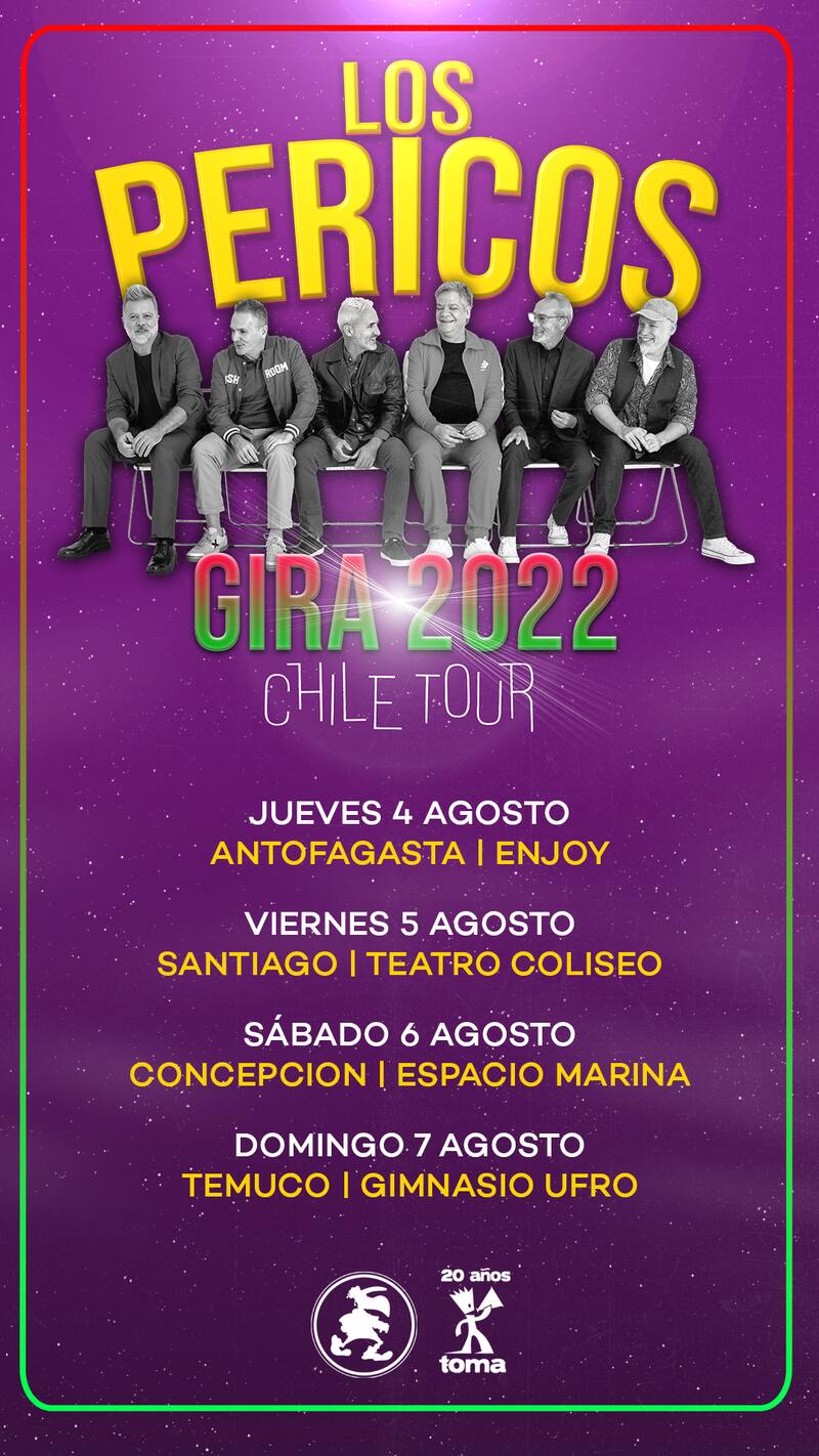La gira de Los Pericos, enmarcada además en la promoción de su último disco de estudio Viva Pericos!, pasará por el Casino Enjoy de Antofagasta (4 de agosto), el Espacio Marina de Concepción (6 de agosto) y el Gimnasio Ufro, de Temuco (7 de agosto).