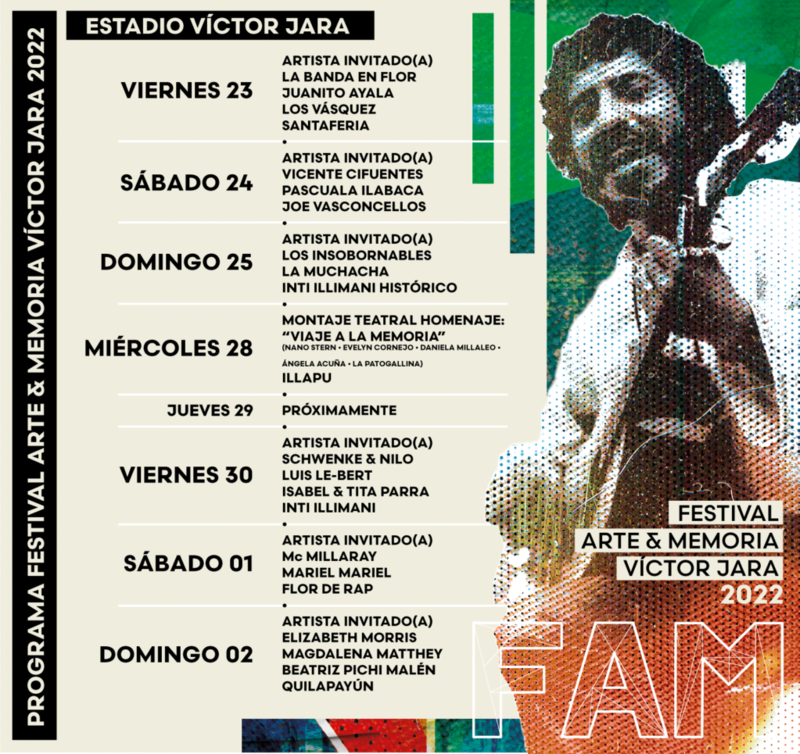 Luego de dos años ceñidos al formato online por la pandemia, el Festival Arte y Memoria (FAM), organizado por la Fundación Víctor Jara y concebido para honrar la memoria del cantautor asesinado durante los primeros días del golpe militar, vuelve a la presencialidad.