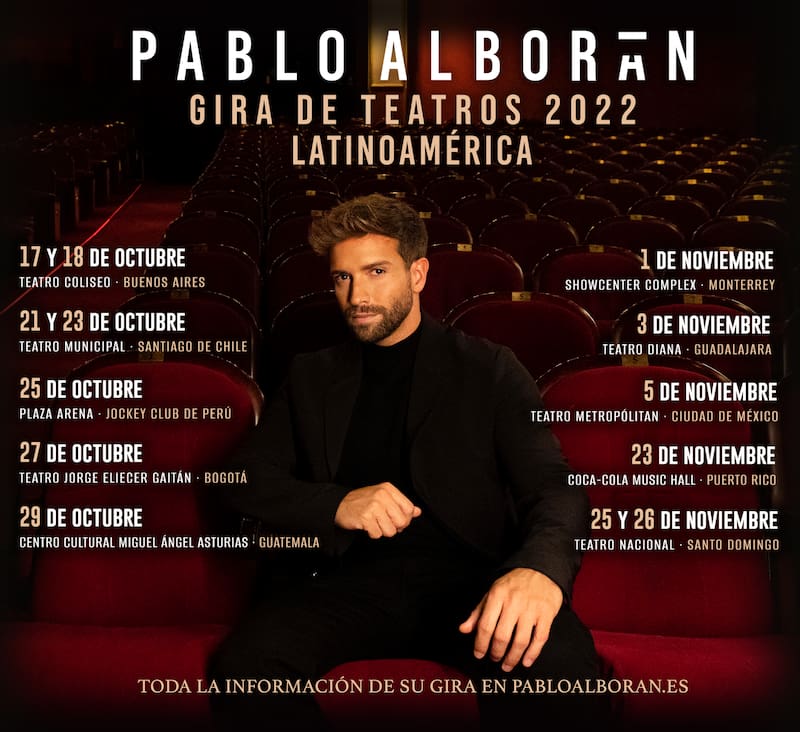 Pablo Alborán arranca su Gira de Teatros 2022 en América Latina. Este año, el cantautor visitará Argentina, Chile, Perú, Colombia, Guatemala, México, Estados Unidos, Puerto Rico y República Dominicana.