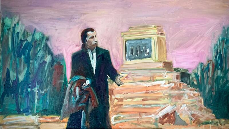 “Tanto en el cine como en la pintura, me interesa investigar la relación imagen-tiempo. Explorar cómo el tiempo no es sólo una convención social y una medida cronológica, también es una clave que nos lleva al inconsciente y la memoria común”, señala en un comunicado de prensa Waissbluth, director de las cintas Los debutantes (2003) y 199 recetas para ser feliz (2008), que presenta una obra en que reimagina el meme de John Travolta en Pulp Fiction (1994).