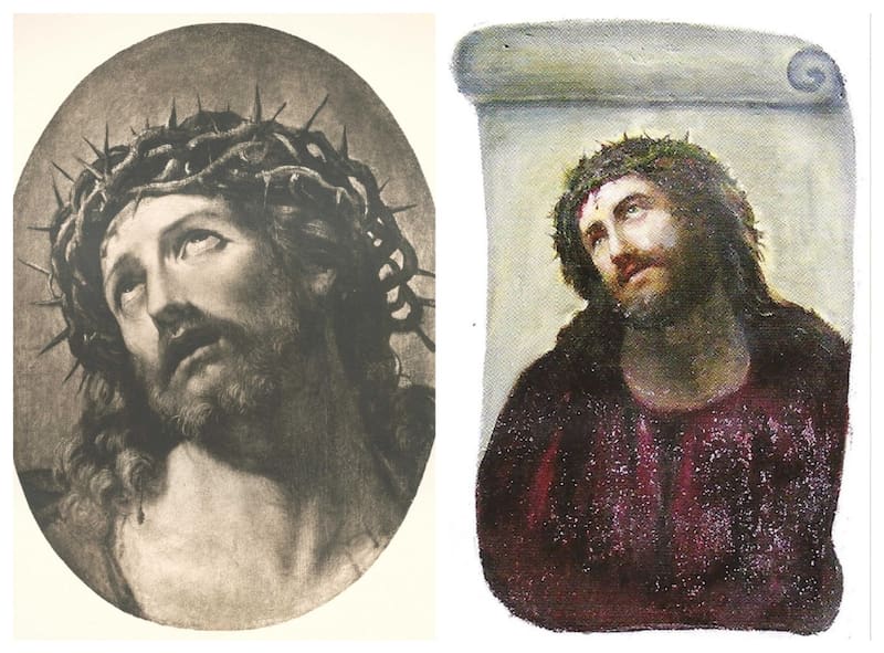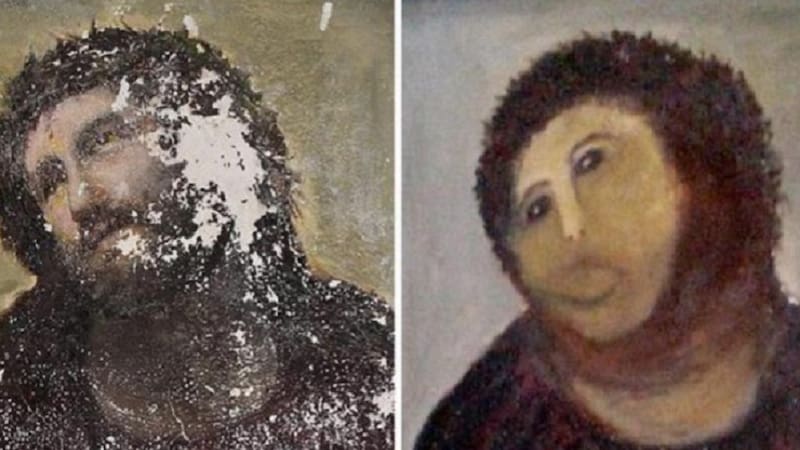 Así empezó su labor, de la que se detuvo para descansar. Sin embargo, a su regreso, el cura párroco no le permitió continuar, el desastre estaba hecho. El sufriente Cristo ahora estaba convertido en unos manchones. El 7 de agosto de 2012, la desmejorada pintura daba la vuelta al mundo ante la burla generalizada. De hecho, un corresponsal de la BBC la definió de un modo nada halagador. Dijo que la obra original derivó en el “esbozo de un mono muy peludo vestido con una túnica de una talla inadecuada”. Crueles, en las redes sociales nació una nueva denominación: el Ecce Mono.