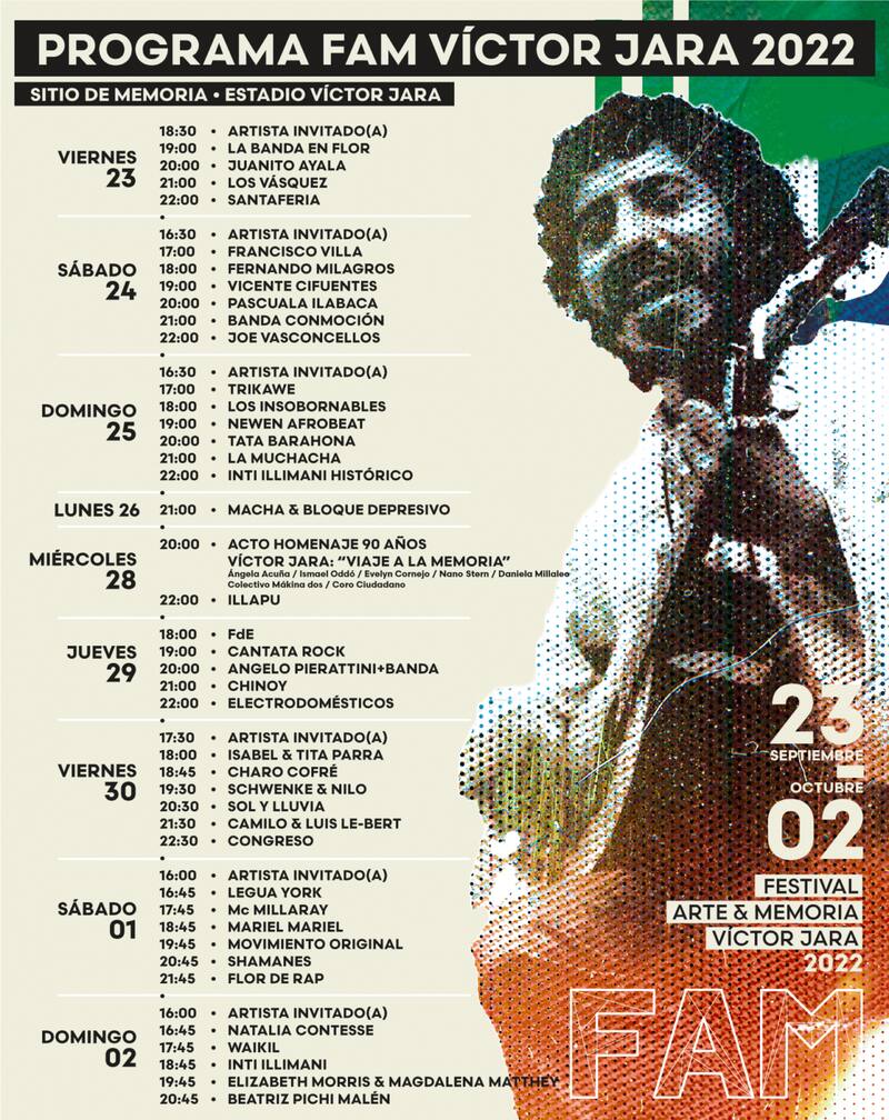 El Festival Arte y Memoria (FAM) vuelve al formato presencial con una programación de 10 días. El evento, organizado por la Fundación Víctor Jara, tendrá un interesante cartel de artistas que van desde Illapu, Beatriz Pichi Malen, Pascuala Ilabaca, Santa Feria, Flor de Rap y Los Vásquez.