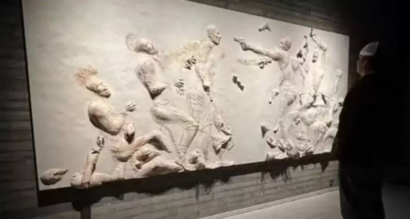 Los otros trabajos del actor incluyen un panel de yeso moldeado que representa una escena narrativa de un tiroteo y un ataúd de bronce fundido del que sobresalen partes del cuerpo humano que intentan liberarse de su encierro.