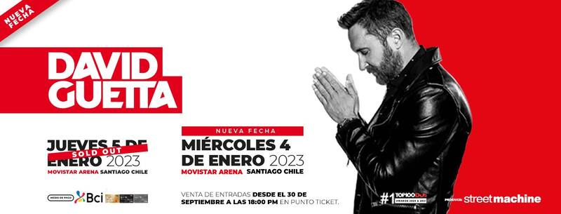 Por éxito total en la venta de entradas, David Guetta, realizará un nuevo show en el país, el próximo 4 de enero de 2023 en el Movistar Arena. Las entradas para el segundo concierto, estarán disponibles a través de PuntoTicket, desde este viernes 30 de septiembre a las 18:00 horas.
