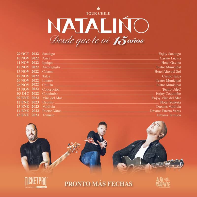 Natalino, celebrará con el público de gran parte de Chile los 15 años de su primer gran éxito, Desde que te vi. En este imperdible y especial show, la banda realizará un homenaje a Zalo Reyes y presentará lo mejor de su trayectoria en versiones renovadas, además de muchas otras sorpresas.