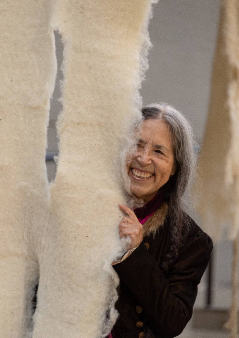 “En los Andes la gente no escribía, tejían significados en los textiles y anudaban cuerdas. Hace cinco mil años crearon el quipu, un poema en el espacio, una forma de recordar, involucrando el cuerpo y el cosmos a la vez. Una metáfora espacial y táctil para la unión de todos”, cuenta la artista, quien lleva más de 50 años trabajando en torno a este patrimonio.