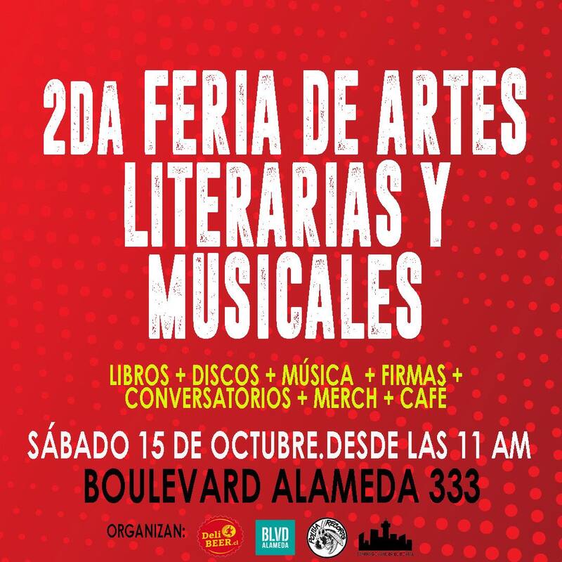 Este sábado 15 de octubre se desarrollará la 2da Feria de Artes Literarias y Musicales, en el Boulevard Alameda (Alameda 333), a media cuadra del Metro UC. En la ocasión habrá diversas actividades, así como la presencia de stands de libros, vinilos, poleras, juguetes, ilustraciones, conversatorios, firmas, artistas visuales, distros, shows acústicos, café, comidas y más. La entrada es liberada.