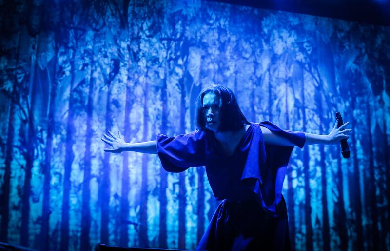 Entre los primeros acordes de Working for the knife, uno de los sencillos de su más reciente larga duración, Laurel Hell, Mitski se desplazó hacia el centro del escenario calzando un vestido azul largo y holgado, ajustado con un cinturón del mismo tono. A través de las pantallas apostadas a los costados se notaba su expresión facial, seria y dramática, con el ceño fruncido y mirando hacia su alrededor casi como si fuera el personaje principal de una intensa obra de teatro.