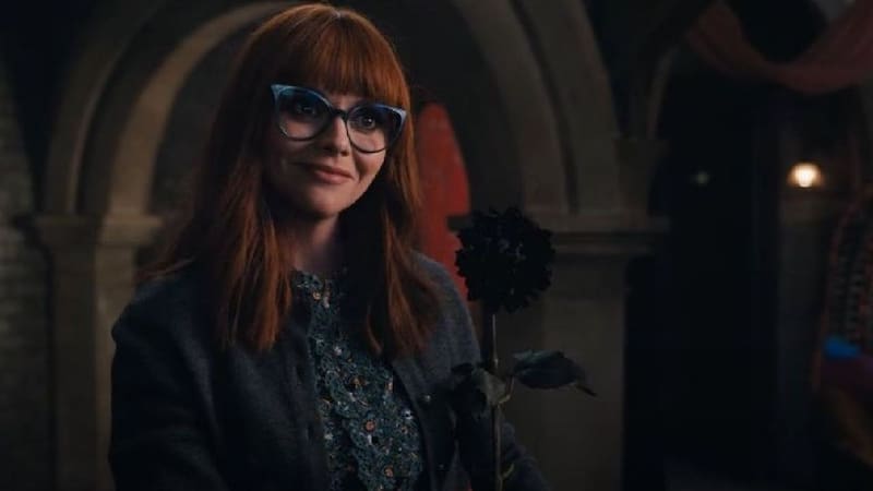 Las niñas atraviesan sus tensos primeros momentos de convivencia cuando a su pieza ingresa otra maestra. De pelo y botas rojizos, se presenta ante la recién llegada como la señora Thornhill y le entrega la flor que eligió especialmente para ella: una dalia negra, como “mi asesinato sin resolver favorito”, dice Merlina.
