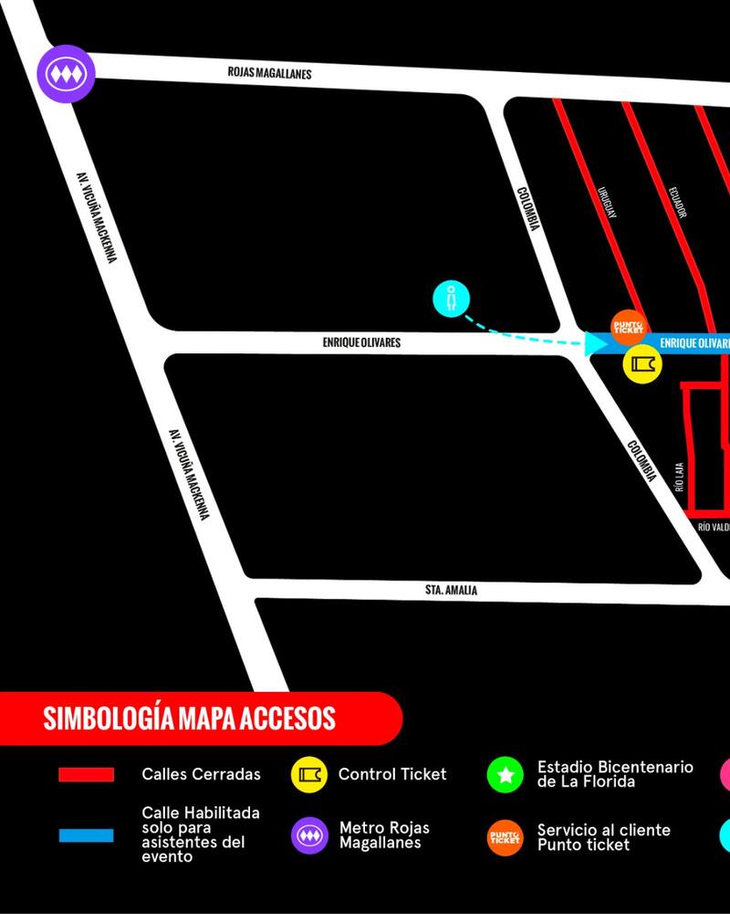 El show de esta noche en el Bicentenario de La Florida tendrá cierres de calles aledañas, como Uruguay, Ecuador, Venezuela, Panamá y Costa Rica, además de un tramo de la calle Enrique Olivares entre Colombia y Costa Rica, cerrado solo para los asistentes al evento. En las intersecciones habrá control de acceso para asegurar que las personas tengan el ticket para asistir al show.