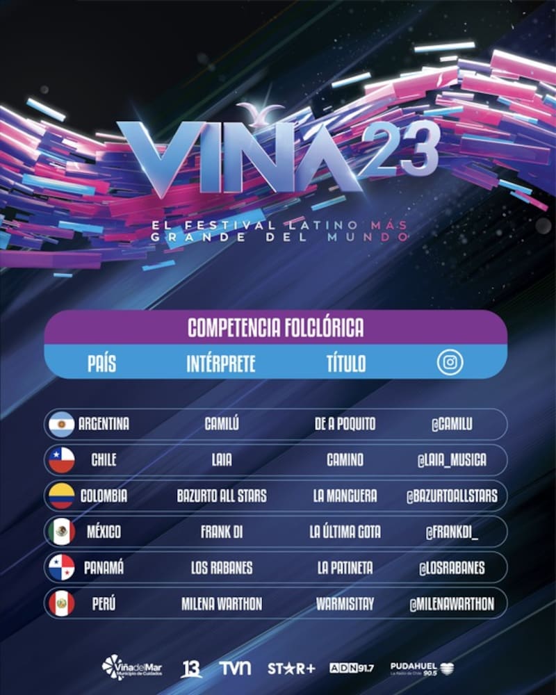En tanto, la competencia folclórica tendrá en competencia: Camilú, por Argentina; Laia, por Chile; Bazurto All Stars, por Colombia; Frank Di, por México; Los Rabanes, por Panamá; Milena Warthon, por Perú.