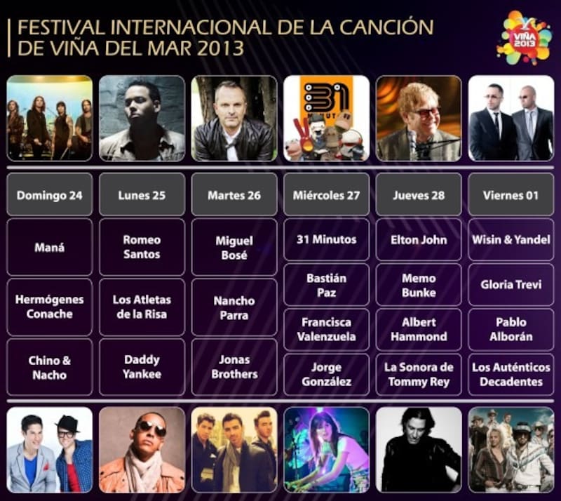 Así, pasaron artistas como Jorge González, Francisca Valenzuela, 31 Minutos, el número anglo con un soberbio Elton John, además de Jonas Brothers, Albert Hammond y como ya se acostumbraba, presencia de música urbana con presentaciones de Daddy Yankee y Wisin & Yandel.