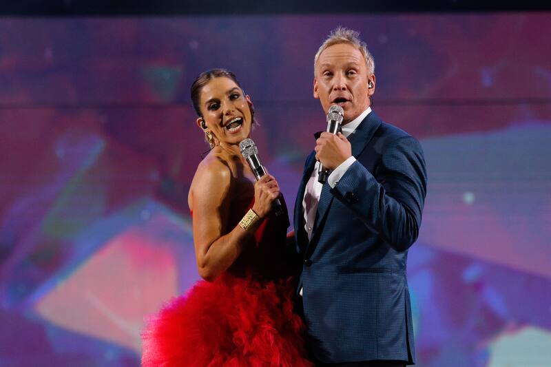“Niñitas, hijos míos, esto es para la tele”, dijo la periodista y conductora, ataviada con un vestido de rojo furioso, antes del piquito con Martín Cárcamo.