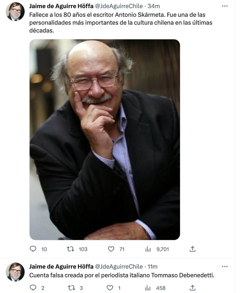 Cerca de las 13.00 horas, una información, supuestamente entregada desde la cuenta del ministro de las Culturas, Jaime de Aguirre, informaba del fallecimiento del escritor nacional Antonio Skármeta, con 82 años.