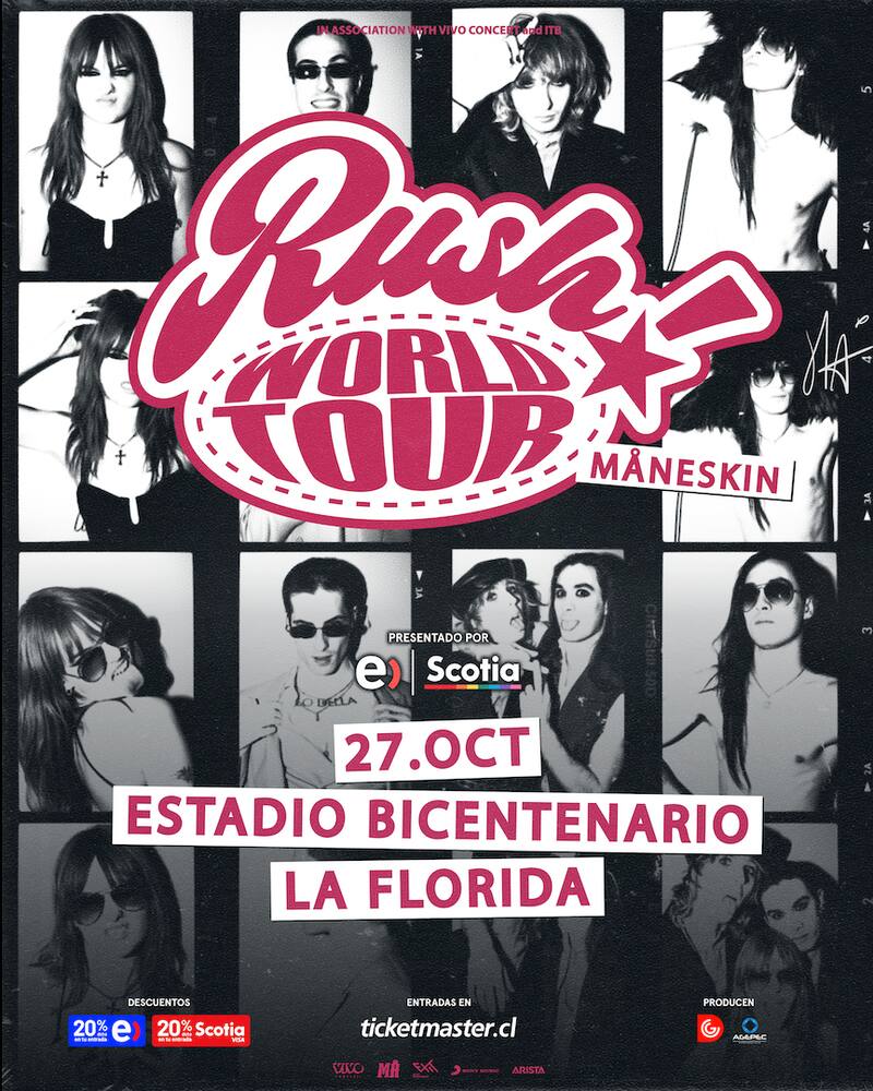 Måneskin, vuelve a Chile. La banda italiana acaba de anunciar una nueva gira mundial, llamada Rush! World Tour, la que pasará por el país el próximo 27 de octubre y se realizará en el Estadio Bicentenario La Florida.