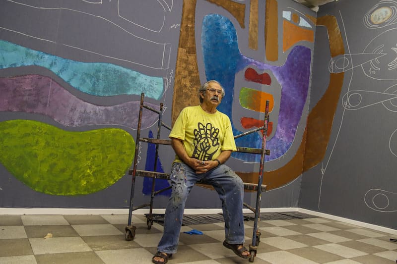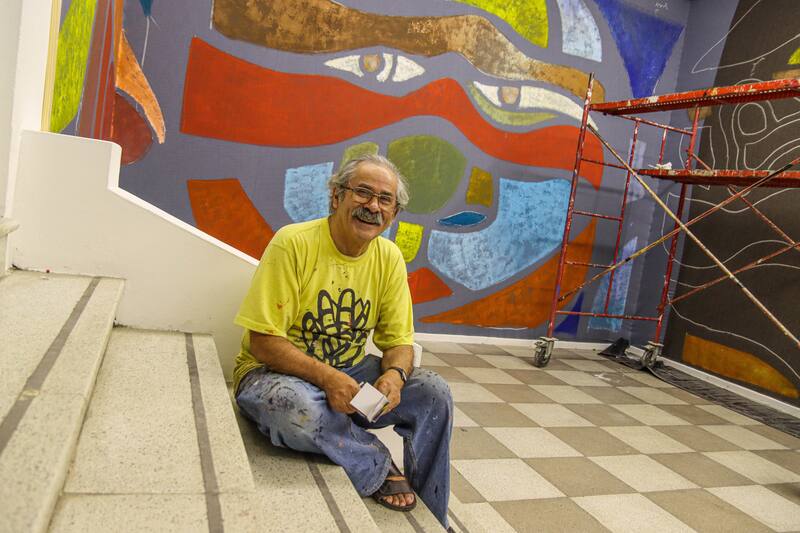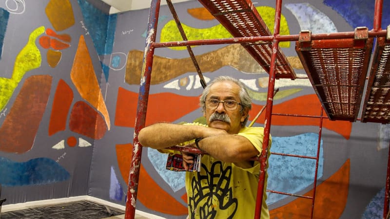 González, es un nombre clave en el arte chileno de los últimos 50 años. No solo ha expuesto en el país, también lo ha hecho en el extranjero. De hecho, se apronta para ir a presentar a España, Estados Unidos y además tiene un mural en Barcelona y dirige un proyecto que está pintando una iglesia en Nápoles. Esencialmente muralista, pero también pintor y grabador, en la exposición podemos ver serigrafías, xilografías, acrílicos sobre tela, bosquejos. Además de un mural justo antes de la entrada, al bajar las escaleras hacia el zócalo.