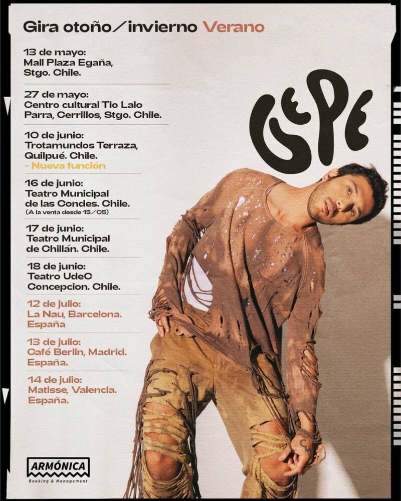 Haciendo una pausa en la grabación de su próximo disco, Gepe agenda una gira para los próximos meses con fechas en Chile y España, para repasar una discografía amplia que lo ha consolidado a lo largo de sus casi dos décadas de trayectoria musical.