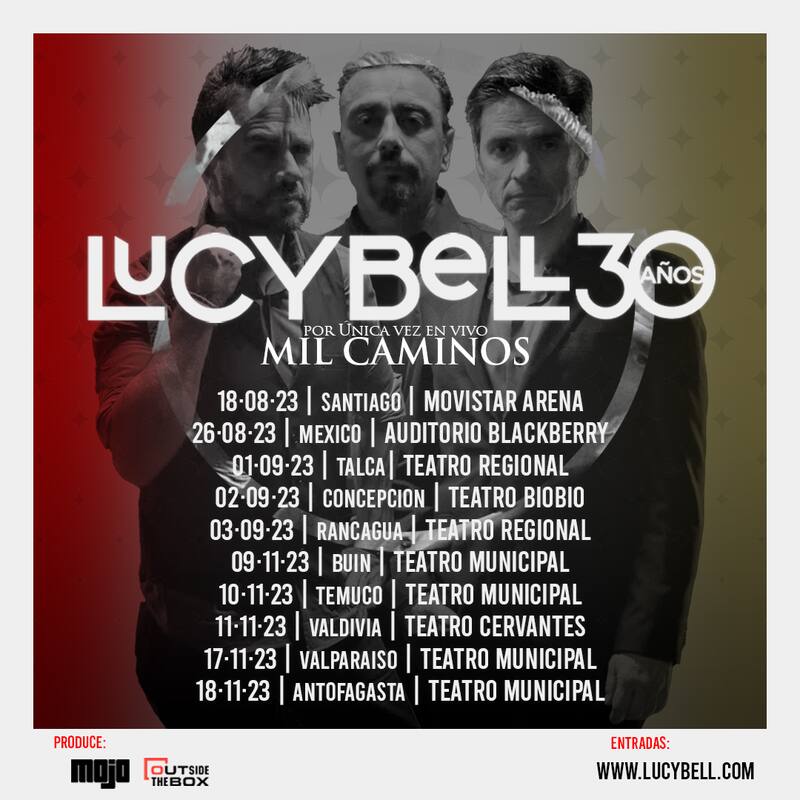 La “Gira Mil Caminos” los llevará por Talca, Concepción, Rancagua, Antofagasta, Valparaíso, Buin, Temuco y Valdivia. Esto, además de incluir una sección acústica para el concierto de Movistar Arena en agosto, lo que se suma al show que Lucybell ofrecerá en Ciudad de México en el Blackberry Center, también en agosto de este año.