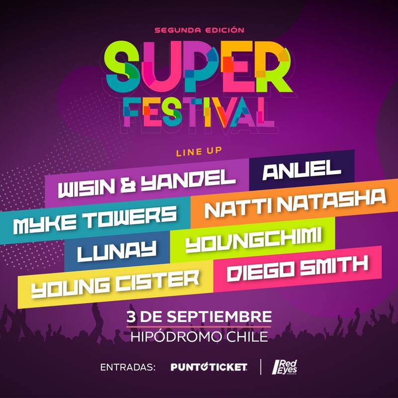 En su segunda edición, ya está confirmado el cartel del Súper Festival. A la cabeza estará el afamado dúo Wisin y Yandel que regresan luego realizar tres exitosas fechas el año pasado, además de Anuel AA, Myke Towers, Lunay, Natti Natasha y Yovngchimi, así como también con los nacionales Young Cister y Diego Smith. El despliegue de artistas tendrá lugar en el Hipódromo Chile, el próximo 3 de septiembre.