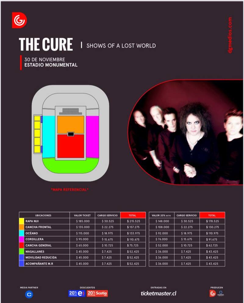 Y, ahora sí, su venida a Santiago es una realidad. Según informó esta mañana la productora DG Medios, The Cure se presentará en Santiago el próximo jueves 30 de noviembre en el Estadio Monumental.