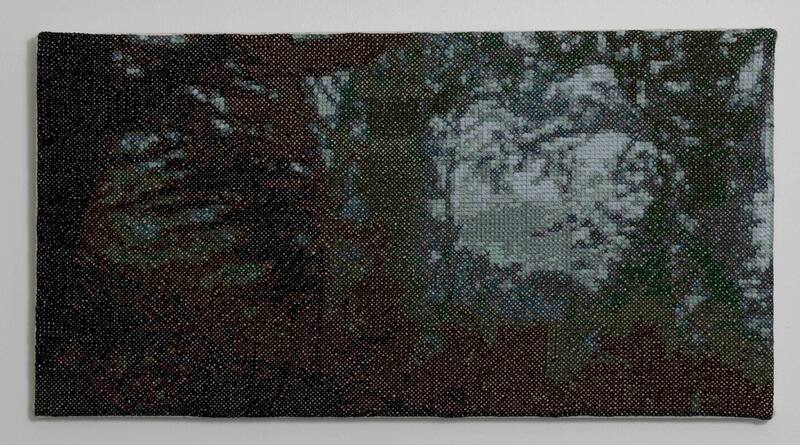 En su nuevo exposición, Goméz trabajó con un grupo de 25 mujeres para crear una gran pieza bordada de 12 metros cuadrados, la cual está inspirada por un liquen, ya que se trata de compuesto y cooperativo: la fusión de una bacteria, un hongo y una alga. Esa forma fue traducida y traspasada a un código digital, que luego fue bordado en punto cruz.