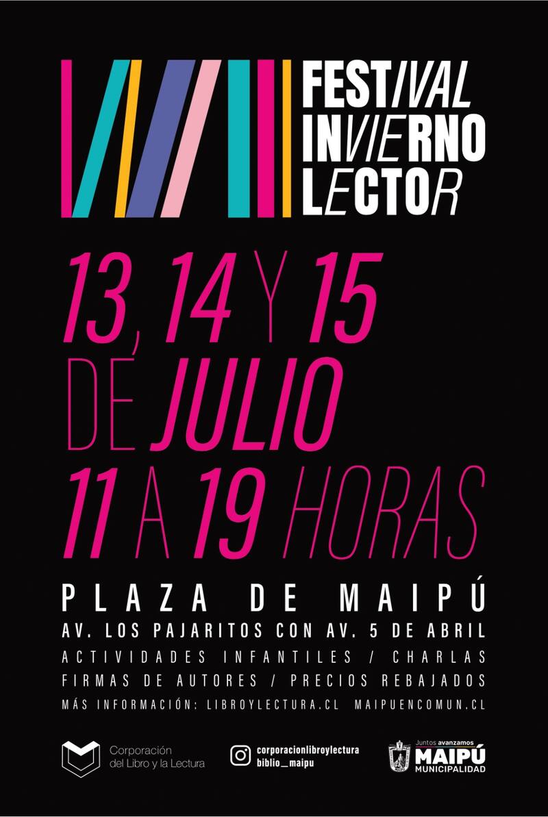 El Festival Invierno Lector se realizará en tres jornadas: jueves 13, viernes 14 y sábado 15 de julio desde las 11.00 horas hasta las 19.00 horas en la Plaza de Maipú (Metro Línea 5, estación Plaza de Maipú). Entrada Gratuita
