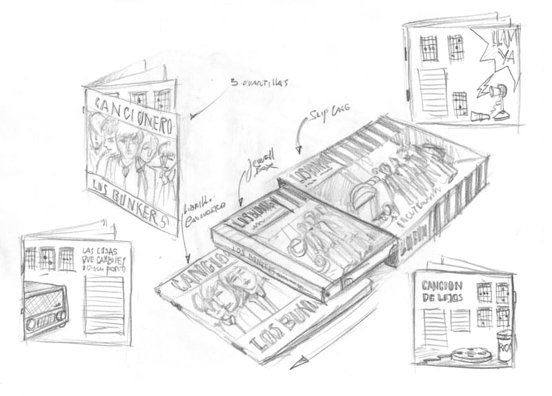 Cadenas, decíamos, fue el diseñador del logo del grupo, conocido como el “Bunkerito”, la imagen de un muchacho con una guitarra al hombro. El proceso tras ese símbolo también está documentado en el libro. “Ese fue un proceso entre Canción de Lejos y La Culpa -rememora-. Entonces me llamaron porque no había logotipo, había solo un isotipo que habíamos desarrollado, pero no tan formal. Hacía falta algo más representativo. Ahí comenzó un proceso muy largo. Los chiquillos me habían dado como pie forzado que fuese lo suficientemente chileno, pero también que fuese visualmente plural. Pasamos desde un chinchinero hasta una guitarra sola, hasta que un día uno de los muchachos que me fue a visitar al departamento de diseño. Y cuando se fue iba con la guitarra en la espalda, ahí dije: ‘eso es’. Representa un universo del que sigue este camino de la música”.