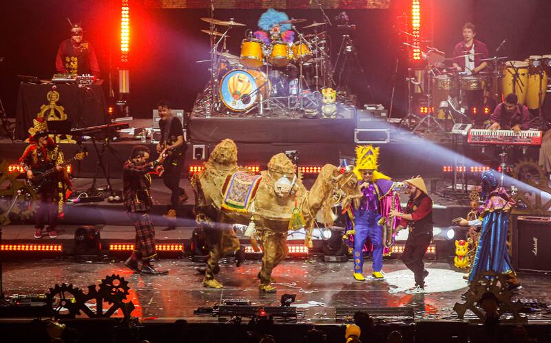 No faltaron los trajes, un infaltable de los shows de los Chancho. El grupo y sus músicos de apoyo lucieron vestuario combinado de chaquetas y vistosos sombreros, que mezclaban imaginaría circense criolla y el sentido de la fantasía de Tim Burton (aunque hubo cambios de vestuario durante la noche). A los costados, la escenografía de ruedas dentadas como engranajes aportaban el toque fantástico como una suerte de máquina del tiempo. De hecho, los interludios entre las secciones del show fueron amenizados por un DJ que despachó fragmentos musicales que evocaban una antigua feria.