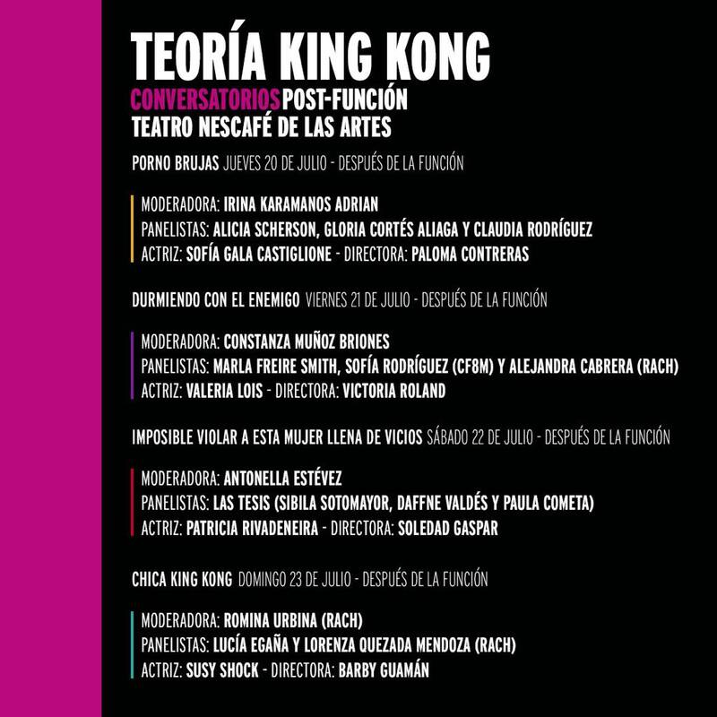 Los conversatorios –tras finalizar cada espectáculo- surgen ante las profundas reflexiones expuestas por la obra argentina “Teoría King Kong” en relación a la posición de la mujer actual respecto a género, sexualidad, discriminación, pornografía, e incluso jurisprudencia, entre otros temas, los cuales serán abordados con cautivante elocuencia por las actrices trasandinas Sofia Gala, Valeria Lois y Susy Shock, así como la invitada chilena al montaje, Patricia Rivadeneira, quienes mediante libreto en mano, interactuarán con el público en todo momento.