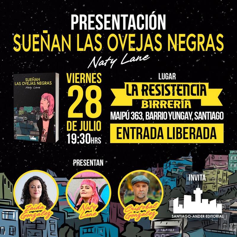 La cita es este viernes 28 de julio a las 19:30 hrs en Bar la Resistencia (Calle Maipú 363, Barrio Yungay). La presentación del libro estará a cargo de la destacada fotógrafa Zaida González, el escritor Emilio Ramón de Santiago Ander y Cristóbal González Lorca, productor y escritor. Sueñan las Ovejas Negras (Santiago-Ander, 2023) abarca temas como las inseguridades físicas, la menstruación, el consumo de fármacos, las citas por aplicaciones, entre otras. Siendo una reivindicación para quienes se sienten fuera de lugar, aquellos que van en otro sentido, que son tachados de rebeldes o sublevados, pero que a través de estos 34 relatos y en las palabras de la misma Naty Lane son simplemente “ovejas negras que sueñan con ser valoradas, incluidas y no estigmatizadas”.