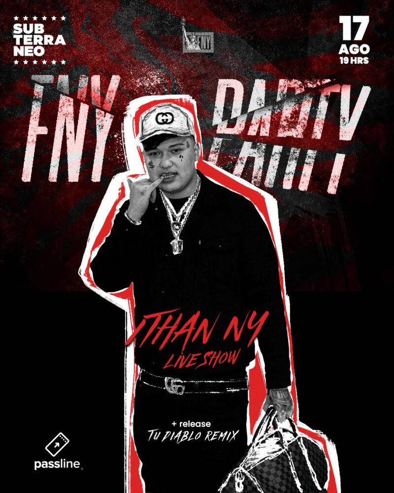 El próximo 17 de agosto, desde las 19:00 horas, el artista despliega FNY PARTY, uno de sus conciertos más esperados a la fecha que no sólo hará un repaso por su cartera de éxitos virales, también será la celebración del remix del sencillo Tu diablo, himno urbano que contará con la participación del destacado puertorriqueño Brray, y los nacionales Nicko OG, Tunechikidd, Jordan 23 y Pailita.