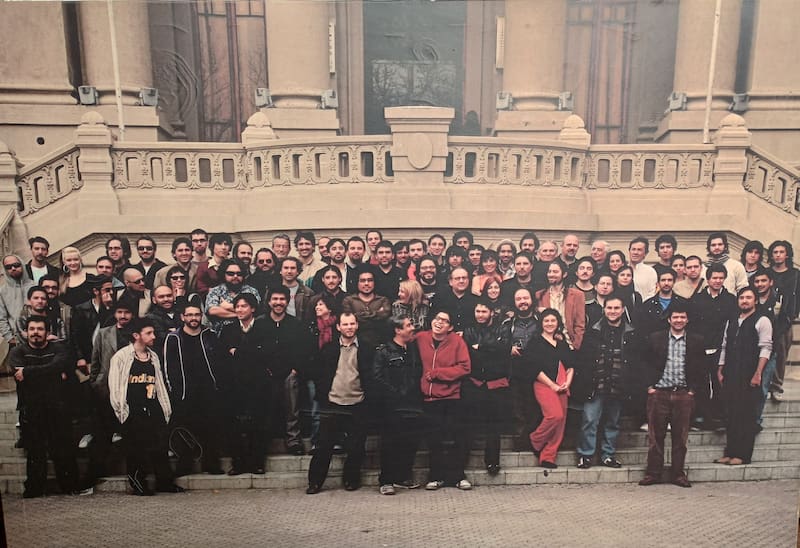Pero la locación de esta fotografía está situada a 8 mil kilómetros de Nueva York y a medio siglo de distancia. Con el Museo de Arte Contemporáneo de Santiago de fondo, una cincuentena de jóvenes músicos – y no tanto– posan alegres para la cámara. Eran los primeros días del Thelonious. La familia ha crecido, pese a que algunos ya no están presentes.
