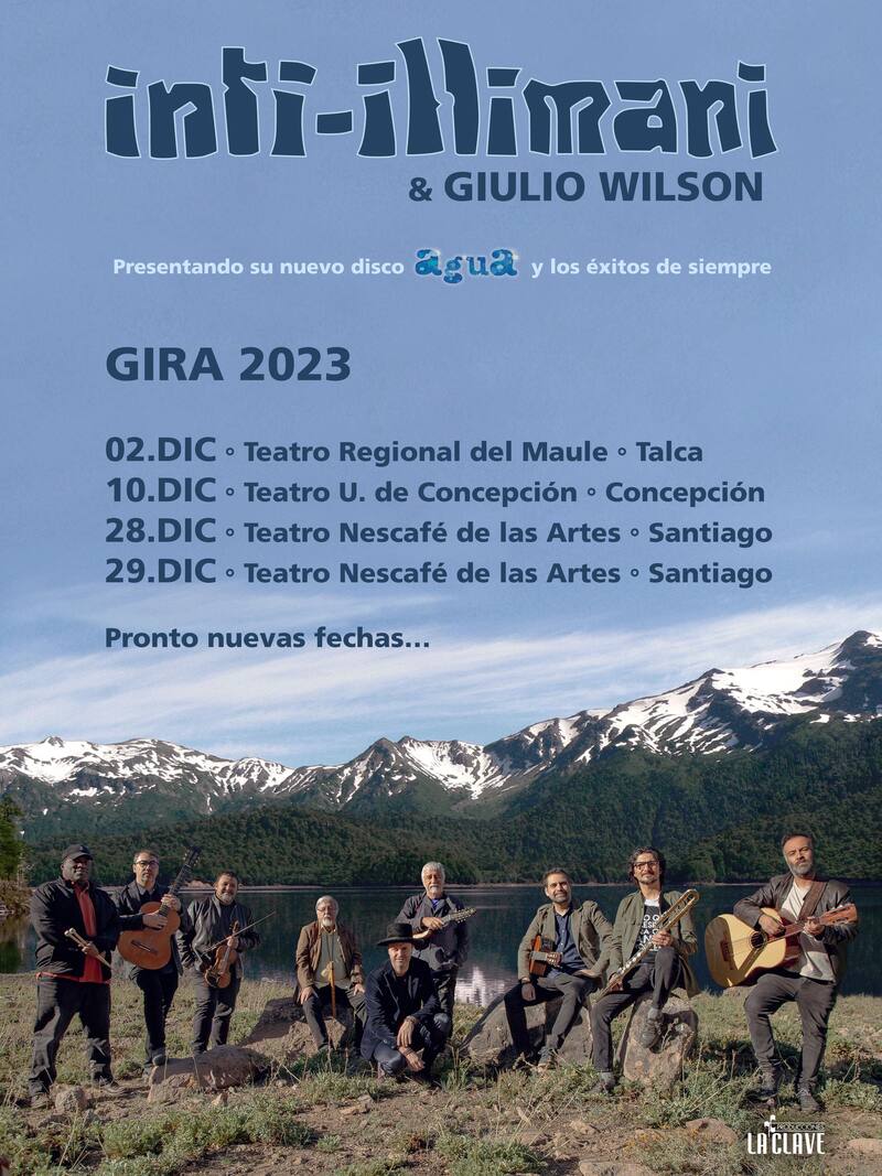 Luego de recorrer exitosamente Europa y Perú, Inti-Illimani presentará en vivo, a lo largo de todo Chile, su nuevo disco llamado Agua. La gira, llamada Agua World Tour 2023, tiene confirmadas presentaciones el 2 de diciembre en Teatro Regional del Maule, 10 de diciembre en el Teatro Universidad de Concepción y el 28 y 29 de diciembre en el Teatro Nescafé de Las Artes.