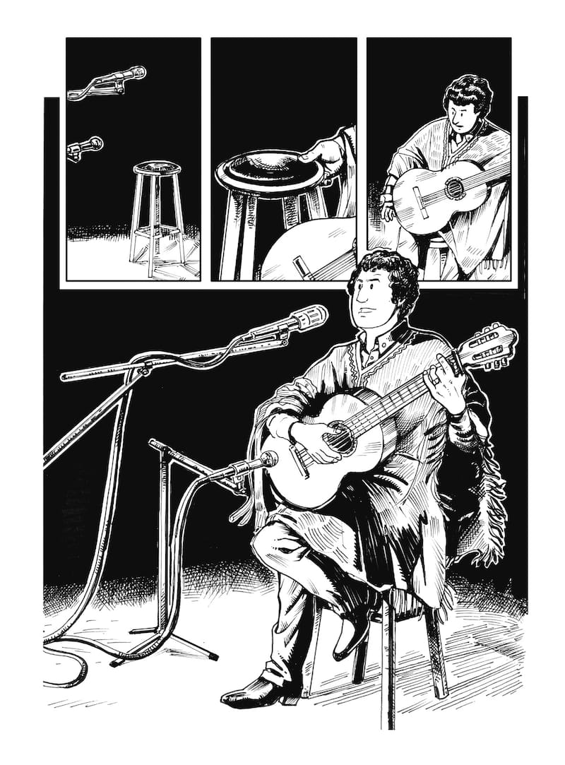 También pasan por otros momentos quizás menos abordados de la vida del hombre de El cigarrito, como su reunión con el Che Guevara o la foto Éramos tan felices, tomada por Luis Poirot. “Siempre supimos que queríamos mostrar también aquellas facetas menos comentadas y conocidas de Víctor Jara, como su importante aporte al teatro chileno, por ejemplo -explica Reyes-. Creo que no solo a través de los grandes momentos, sino que también a través de ciertas pequeñas anécdotas puedes comprender al ser humano que habita esos instantes y que lo reflejan de cuerpo entero. El momento de la famosa foto de Luis Poirot era un hito indiscutible que debíamos abordar y para eso conseguimos el testimonio directo de don Luis que nos ayudó a reconstruir ese hermoso momento de primera fuente. Jara es una figura mítica y tratar de atisbarlo a través de instantes significativos, pequeños y también desde momentos emblemáticos y más conocidos es lo que intentamos hacer en esta novela gráfica.”