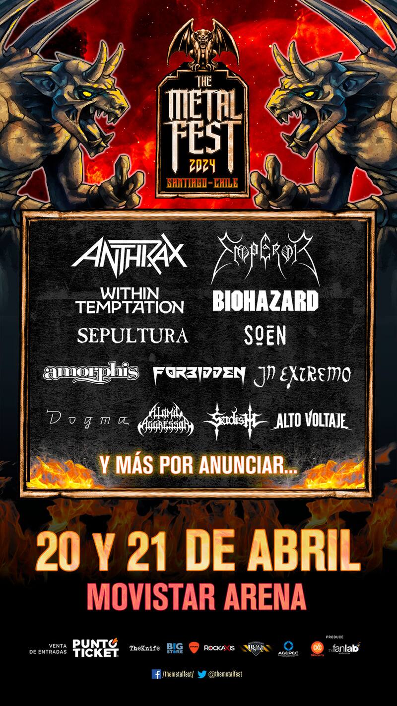 El evento de metal más importante de Chile y la región, The Metal Fest, llegará con dos jornadas completamente demoledoras, los días sábado 20 y domingo 21 de abril de 2024 en el Movistar Arena. Para esta versión, los confirmados son Anthrax, Emperor, Within Temptation, Biohazard, Sepultura, Soen, Amorphis, Forbidden e In Extremo, y las chilenas Dogma, Atomic Agressor, Sadism y Alto Voltaje, junto a muchas otras bandas por confirmar.