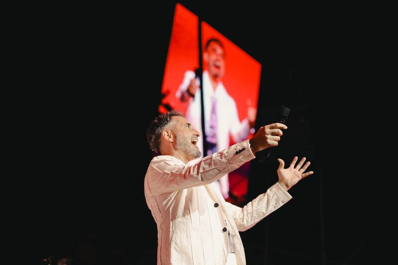 Luego siguieron Deseo, Transporte, Cinturón blanco y Corazón impar, track que, según presentó el músico, alude a la renuncia de aquella idea romántica de la búsqueda de la media naranja. “Nosotros ya somos una naranja completa, ya venimos complementados”, teorizó.