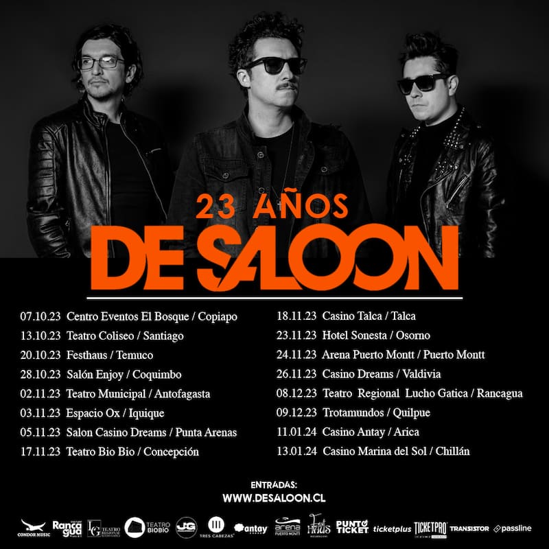 De Saloon se consolidó como uno de los nombres importantes del rock chileno del nuevo milenio. Por estos días se aprestan a celebrar sus 23 años de carrera con un show de larga duración en el Teatro Coliseo este viernes 13 de octubre. Una ocasión en que repasarán su discografía en un set de 23 temas, incluyendo todos sus singles, además de una puesta en escena especial para la ocasión. El show es parte de una gira de celebración que ya tiene fechas confirmadas en ciudades como Copiapó, Temuco, Coquimbo, Antofagasta, Iquique, Punta Arenas, Concepción, Talca, Osorno, Puerto Montt, Valdivia, Rancagua, Quilpué, Arica y Chillán.