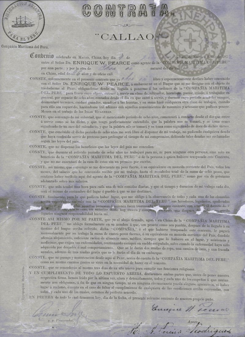 Como suele ocurrir, al momento de firmar un contrato, una trampa dejaba prácticamente indefensos a los chinos ante quienes los contrataban. “En el contrato dice ‘que durante el referido periodo de ocho años no trabajaré para ninguna otra persona, sino solo en beneficio de la ‘Compañía Marítima del Perú' -cuenta Mellafe-. Y si se revisan los dos ‘Conste’ anteriores, verás que se contraponen y el chino quedaba en la absoluta indefensión”.