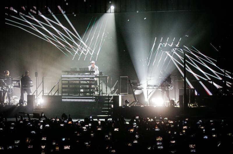 La voz de Neil Tennant fue impecable y fiel a los originales desde la primera sílaba. Ambos vistieron sendos abrigos blancos como para una temporada en la nieve en un filme de espías, y símbolos ocultando sus rostros; parte de la parafernalia habitual de Pet Shop Boys, siempre conscientes de la necesidad de montar espectáculo visual extra, más allá de su presencia.