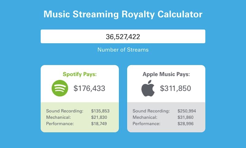 En el desglose, se consideran tres ítems: Sound recording, que corresponde al pago de la grabación de sonido al propietario de los derechos de autor; Mechanical, que son las regalías mecánicas pagadas al editor de música (que luego paga al compositor); Performance, que corresponde a las regalías de ejecución pagadas a organizaciones de derechos de ejecución (PRO) ASCAP, BMI, GMR y SESAC.